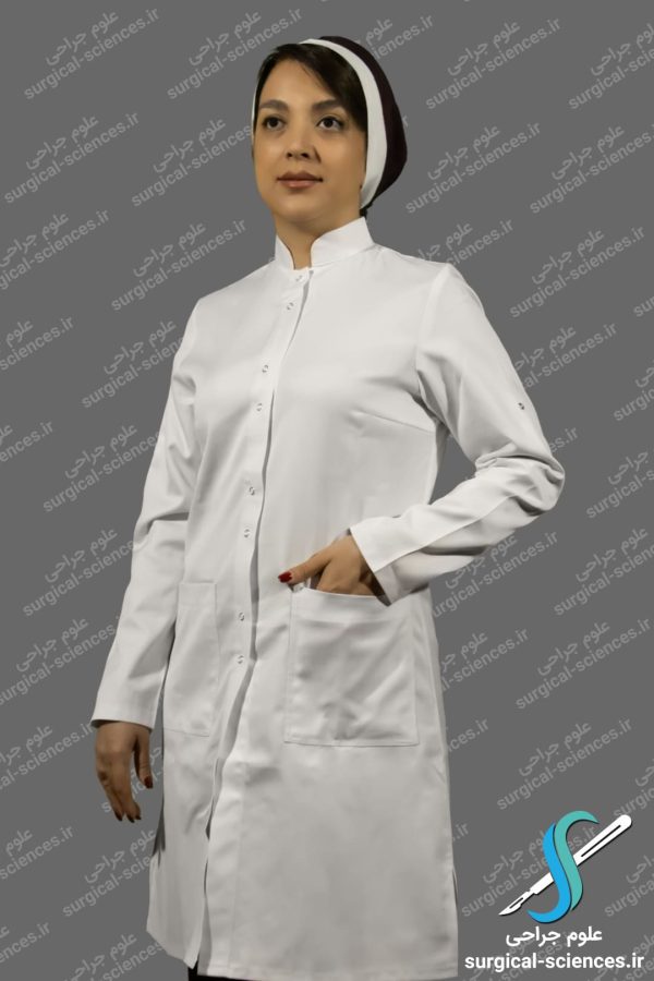 روپوش پزشکی زنانه کد406 دوخته شده با پارچه ترگال و طرح شیک مناسب پرسنل و دانشجویان مراکز درمانی، آزمایشگاهی و آموزشی.